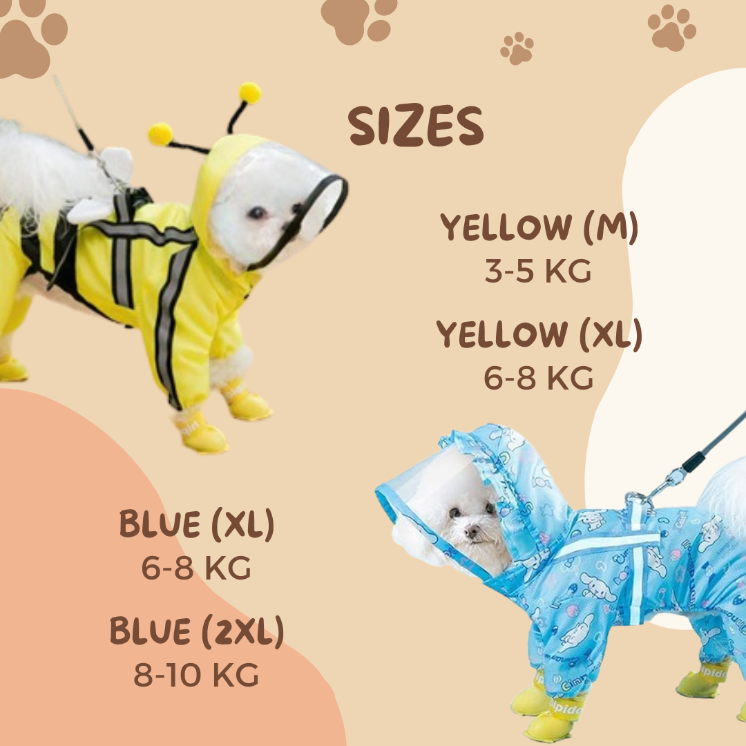 For a cheerful pop of color on gloomy days, our Yellow Rain Coats are available in M and XL sizes. The medium size (3-5KG) is suitable for small to medium-sized dogs, while the XL (6-8KG) size ensures a comfortable fit for larger breeds. The bright yellow hue not only adds a dash of sunshine to gray days but also enhances visibility for added safety during walks.